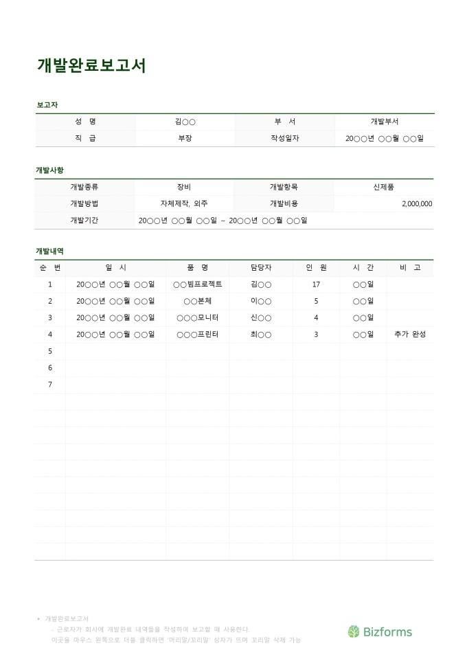 9,000원/월개발완료보고서입니다. 성명, 부서, 직급, 작성일자, 개발종류, 개발항목, 개발방법, 개발비용, 개발기간, 순번, 일시, 품명, 담당자, 인원, 시간, 비고 등의 항목으로 구성되어 있습니다.