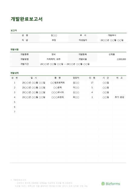 개발완료보고서입니다. 성명, 부서, 직급, 작성일자, 개발종류, 개발항목, 개발방법, 개발비용, 개발기간, 순번, 일시, 품명, 담당자, 인원, 시간, 비고 등의 항목으로 구성되어 있습니다.