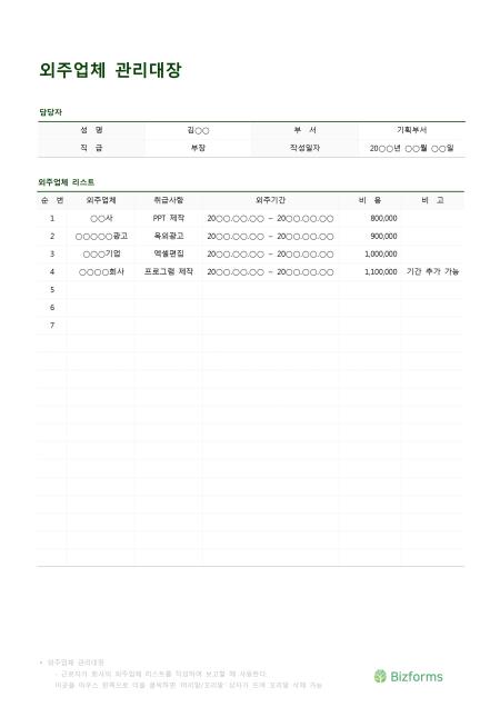 외주업체관리대장입니다. 성명, 부서, 직급, 작성일자, 순번, 외주업체, 취급사항, 외주기간, 비용, 비고 등의 항목으로 구성되어 있습니다.