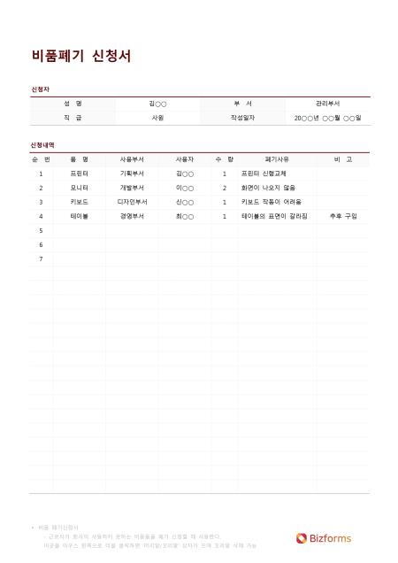 비품폐기신청서입니다. 성명, 부서, 직급, 작성일자, 순번, 품명, 사용부서, 사용자, 수량, 폐기사유, 비고 등의 항목으로 구성되어 있습니다.