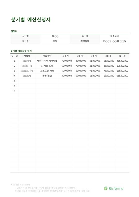 분기별예산신청서입니다. 성명, 부서, 직급, 작성일자, 순번, 사업명, 사업목적, 1분기, 2분기, 3분기, 4분기, 합계 등의 항목으로 구성되어 있습니다.
