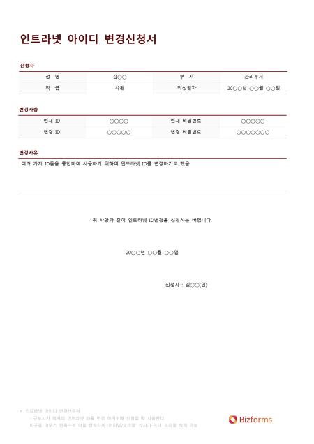 인트라넷아이디변경신청서입니다. 성명, 부서, 직급, 작성일자, 현재 ID, 현재 비밀번호, 변경 ID, 변경 비밀번호, 변경사유 등의 항목으로 구성되어 있습니다.
