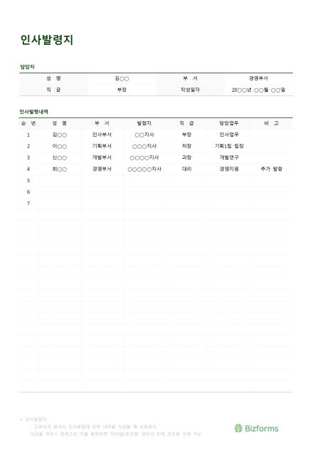 인사발령지입니다. 성명, 부서, 직급, 작성일자, 순번, 성명, 부서, 발령지, 직급, 담당업무, 비고 등의 항목으로 구성되어 있습니다.