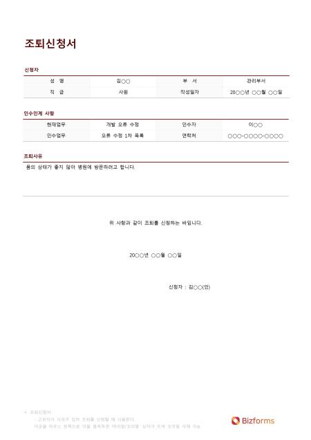 조퇴신청서입니다. 성명, 부서, 직급, 작성일자, 현재업무, 인수자, 인수업무, 연락처, 조퇴사유 등의 항목으로 구성되어 있습니다.