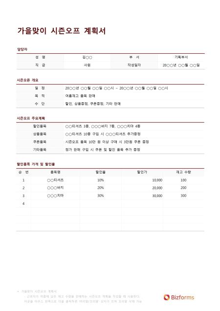 가을맞이시즌오프계획서입니다. 성명, 부서, 직급, 작성일자, 일정, 목적, 수단, 할인품목, 상품품목, 쿠폰품목, 기타품목, 순번, 품목명, 할인율, 할인가, 재고 수량 등의 항목으로 구성되어 있습니다.