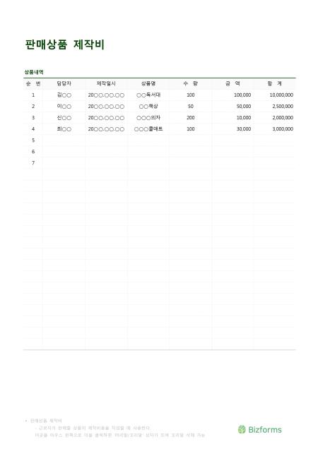 판매상품제작비입니다. 순번, 담당자, 제작일시, 상품명, 수량, 금액, 합계 등의 항목으로 구성되어 있습니다.