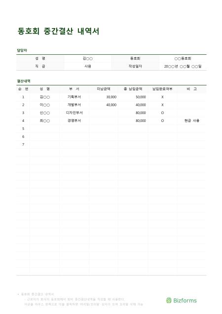 동호회중간결산내역서입니다. 성명, 동호회, 직급, 작성일자, 순번, 성명, 부서, 미납금액, 총 납입금액, 납입완료여부, 비고 등의 항목으로 구성되어 있습니다.