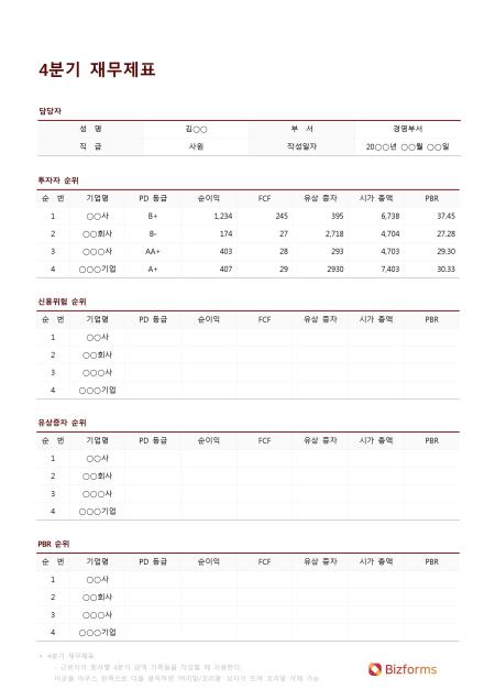 4분기 재무제표입니다. 성명, 부서, 직급, 작성일자, 순번, 기업명, PD 등급, 순이익, FCF, 유상 증자, 시가 총액, PBR, 투자자 순위, 신용위험 순위, 유상증자 순위, PBR 순위 등의 항목으로 구성되어 있습니다.