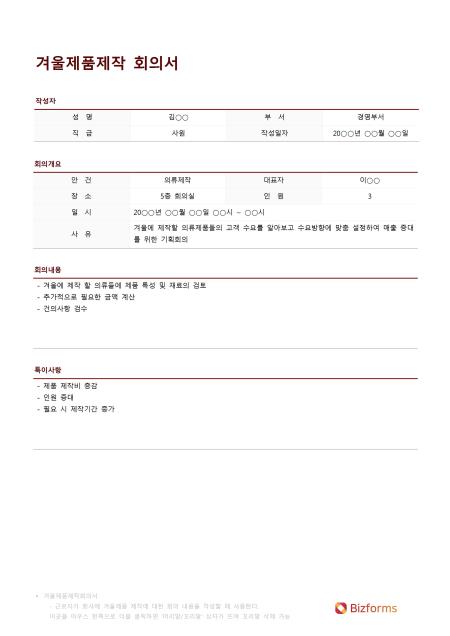 겨울제품제작회의서입니다. 성명, 부서, 직급, 작성일자, 안건, 대표자, 장소, 인원, 일시, 사유, 회의내용, 특이사항 등의 항목으로 구성되어 있습니다.