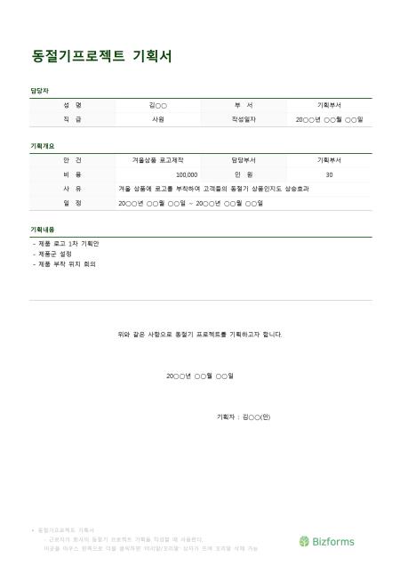 동절기프로젝트기획서입니다. 성명, 부서, 직급, 작성일자, 안건, 담당부서, 비용, 인원, 사유, 일정, 기획내용 등의 항목으로 구성되어 있습니다.