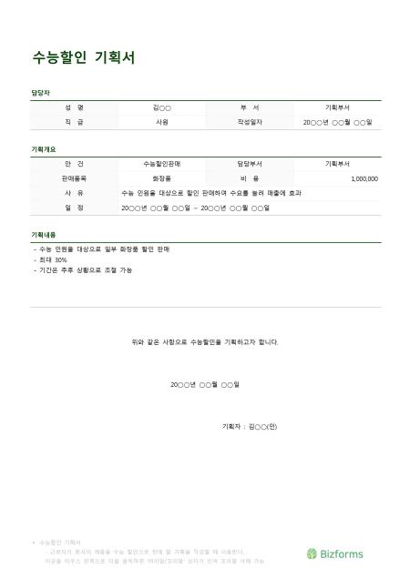 수능할인기획서입니다. 성명, 부서, 직급, 작성일자, 안건, ㅍ담당부서, 판매품목, 비용, 사유, 일정, 기획내용 등의 항목으로 구성되어 있습니다.