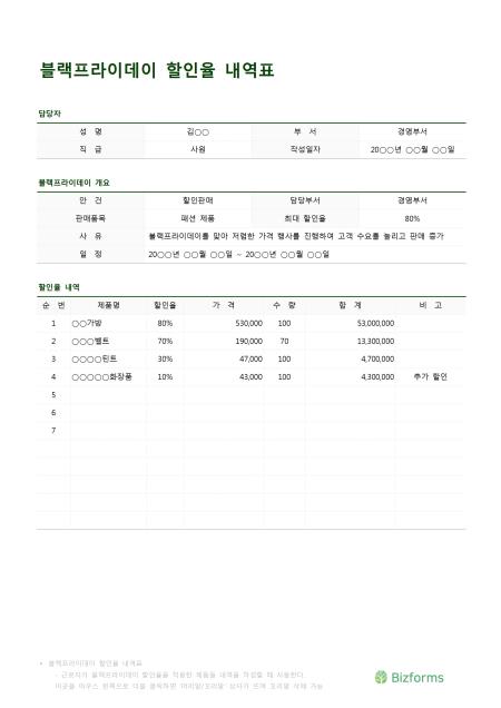 블랙프라이데이할인율내역표입니다. 성명, 부서, 직급, 작성일자, 안건, 담당부서, 판매품목, 최대 할인율, 사유, 일정, 순번, 제품명, 할인율, 가격, 수량, 합계, 비고 등의 항목으로 구성되어 있습니다.
