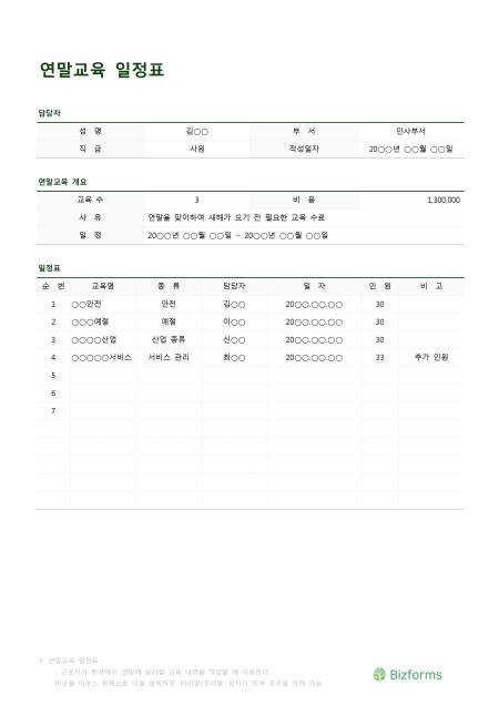 연말교육일정표입니다. 성명, 부서, 직급, 작업일자, 교육 수, 비용, 사유, 일정, 순번, 교육명, 종류, 담당자, 일자, 인원, 비고 등의 항목으로 구성되어 있습니다.