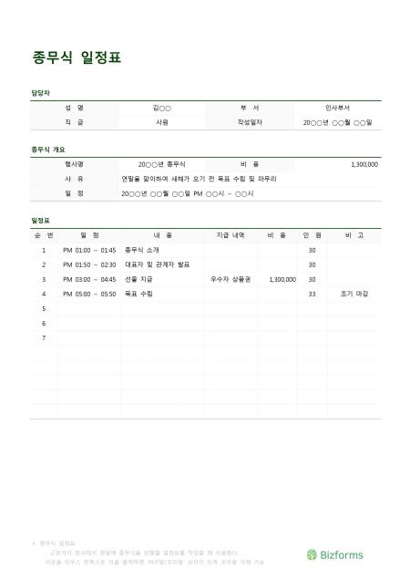 종무식일정표입니다. 성명, 부서, 직급, 작성일자, 행사명, 비용, 사유, 일정, 순번, 일정, 내용, 지급 내역, 비용, 인원, 비고 등의 항목으로 구성되어 있습니다.