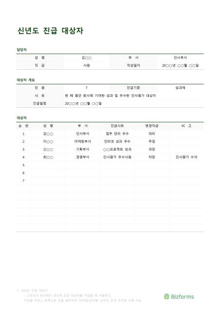 신년도진급대상자입니다. 성명, 부서, 직급, 작성일자, 인원, 진급기준, 사유, 진급일정, 순번, 성명, 부서, 진급사유, 변경직급, 비고 등의 항목으로 구성되어 있습니다.
