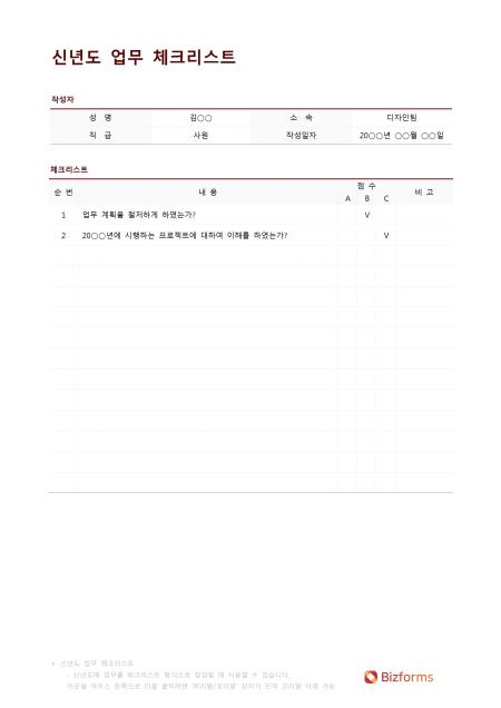 신년도 업무 체크리스트 입니다. 새해를 맞이하여 업무를 체크리스트 형태로 점검할때 사용할 수 있습니다. 작성자, 체크리스트로 구성되어 있습니다.