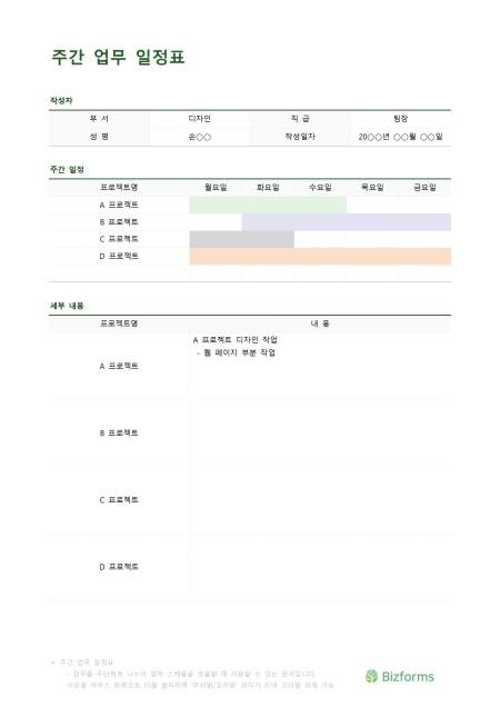 주간 업무 일정표 입니다. 프로젝트를 주단위로 나누어 일정표 형식으로 세부내용을 정리할때 사용할 수 있는 문서입니다. 작성자, 주간일정, 세부내용으로 구성되어 있습니다.