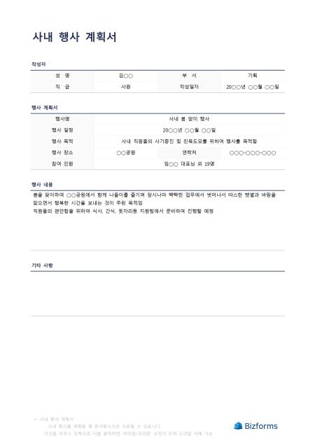 사내 행사 계획서 입니다. 사내 행사를 진행할때 전체적인 내용, 일자, 장소, 참여인원, 개요 등을 정리하여 계획할때 사용할 수 있는 문서입니다.