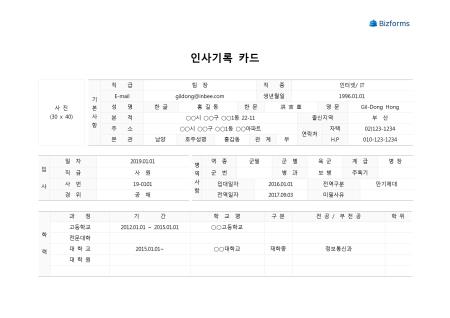 2019년 인사기록카드 입니다. 2019년을 맞이하여 새롭게 개선하여 채용된 직원의 인적사항 및 신변에 관련된 사항들을 기록하고 효율적인 인사관리를 위해 사용할 수 있는 문서입니다.