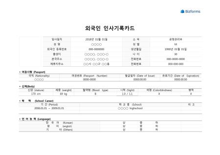외국인근로자용 인사기록카드 입니다. 외국인 근로자를 채용한 후 외국인 근로자의 인적사항 및 신변사항을 기록하여 관리할때 사용할 수 있는 문서입니다.