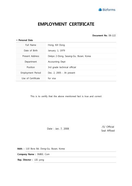 영문 재직증명서 입니다. 영문 재직증명서는 개인이 현재 특정 회사에 재직 중임을 공적으로 증명하는 영문 문서로써, 해외 취업, 비자 신청이나 유학 시 재정 보증 서류 등으로 주로 활용되며, Certificate of Employment와 같은 명칭으로 발급 됩니다. 발급 받는 사람의 재직 기간, 직위, 소속 회사명 등의 주요 정보가 정확히 명시되어야 합니다.