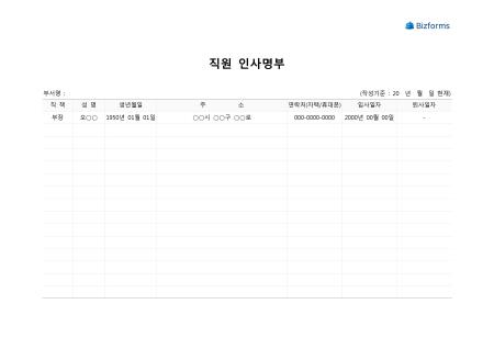 직원인사명부 입니다. 직원의 직책, 성명, 생년월일, 주소, 연락처, 입사일자, 퇴사일자 등 직원의 신상을 간단하게 작성하여 관리할 수 있는 문서입니다.