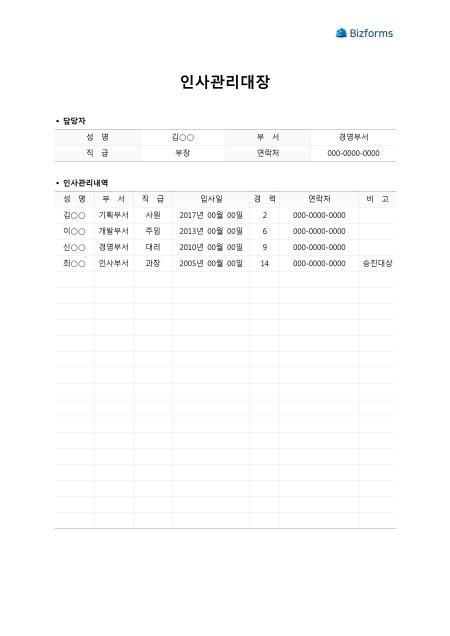 인사관리대장 입니다. 직원의 성명, 부서, 직급, 입사일, 경력, 연락처 등을 간단하게 작성하여 관리에 도움을 줄 수 있는 문서입니다.