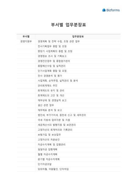 업무분장표 입니다. 부서별로 업무를 나열하여 직원들에게 업무를 분장할때 사용할 수 있는 문서입니다.