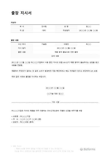 출장 지시서 입니다. 업무상 사유로 인하여 출장을 지시할때 사용할 수 있는 문서입니다.