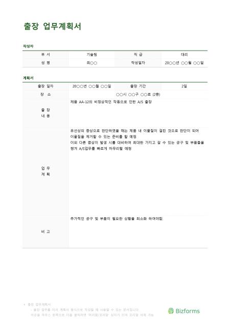 출장 업무계획서 입니다. 업무를 출장가기 전 어떤 업무를 할 것인지 미리 계획할때 사용할 수 있는 문서입니다.