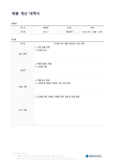 매출 개선 대책서입니다. 전체적인 매출이 적어졌을 경우 매출을 다시 올리기위한 회의 및 일정을 진행하는 내용으로 사용할 수 있습니다.