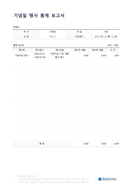기념일 행사 통계보고서 입니다. 기념일을 맞이하여 행사를 진행을 하기 전과 후의 매출차이를 비교하여 보고할때 사용할 수 있는 문서입니다.
