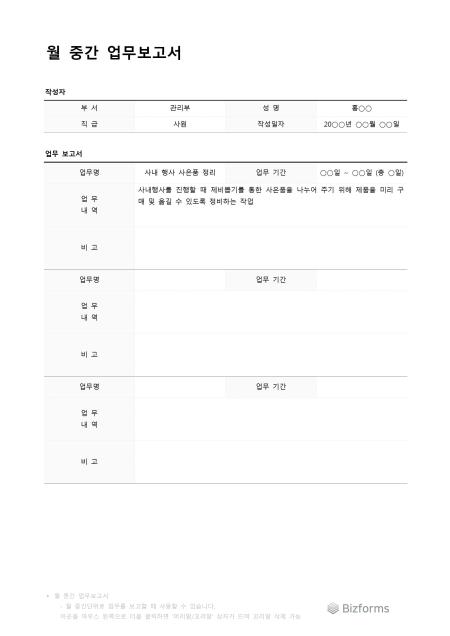 월 중간 업무 보고서 입니다. 월 중간단위로 업무를 진행한 내역을 보고서 형식으로 작성할때 사용할 수 있습니다.
