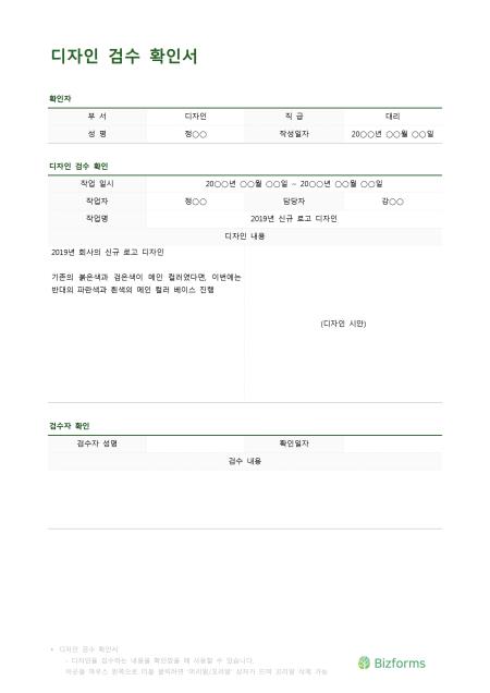 디자인 검수 확인서 입니다. 디자인을 관련하여 검수를 확인받기 위하여 작성할때 사용할 수 있는 문서입니다.