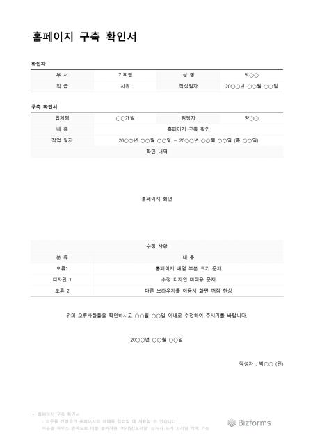 홈페이지 구축 확인서 입니다. 외주 및 업무를 통하여 홈페이지를 구축한것을 확인하여 수정을 요할때 사용할 수 있습니다.