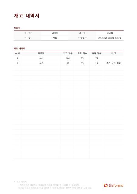 재고 내역서 입니다. 자체적으로 생산하는 재고를 간단하게 조사할 수 있는 문서입니다.