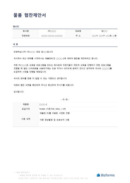 물품 협찬 제안서 입니다. 물품 협찬건에 대하여 타사에 제안을 하며 그에 따른 이익을 제안할때 사용할 수 있는 문서입니다.