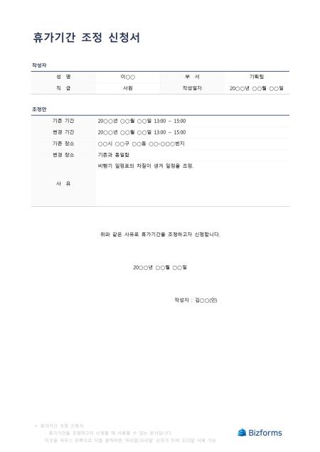 휴가기간조정신청서입니다. 휴가기간이 변경되어 회사에 바뀐 휴가기간 조정 신청서를 작성할 때 사용할 수 있는 문서입니다.