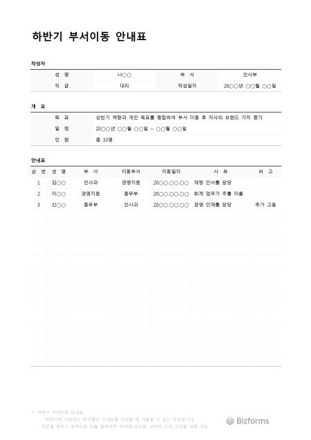하반기부서이동안내표입니다. 하반기에 부서가 이동되어 안내표를 작성할 때 사용할 수 있는 문서입니다.