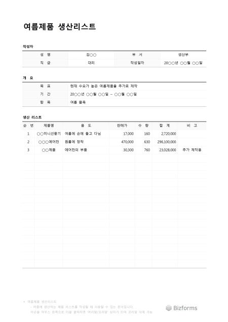 여름제품생산리스트입니다. 여름에 생산할 제품 리스트를 작성할 때 사용할 수 있는 문서입니다.