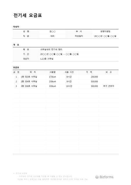 전기세요금표입니다. 전기세 사용량과 요금표를 작성할 때 사용할 수 있는 문서입니다.