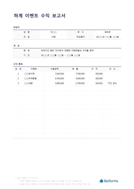 하계이벤트수익보고서입니다. 하계에 시행 했었던 이벤트의 수익 보고서를 작성할 때 사용할 수 있는 문서입니다.