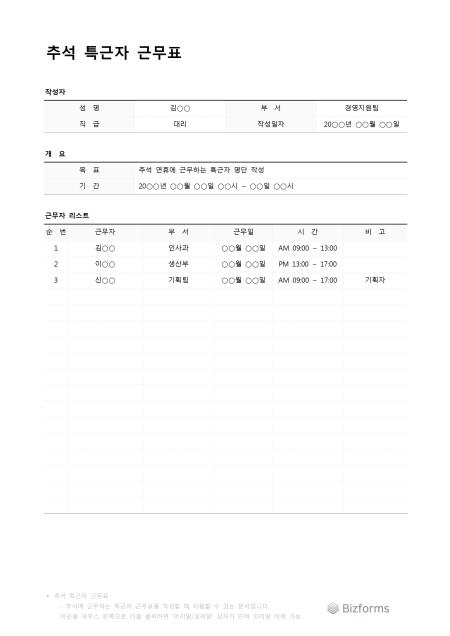 추석특근자근무표입니다. 추석에 근무하는 특근자 근무표를 작성할 때 사용할 수 있는 문서입니다.