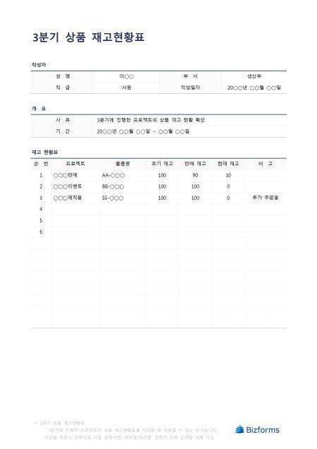 3분기상품재고현황표입니다. 3분기에 진행한 프로젝트의 상품 재고를 작성할 때 사용할 수 있는 문서입니다.