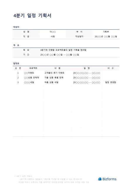4분기일정기획서입니다. 4분기에 시행하는 일정표 기획서를 작성할 때 사용할 수 있는 문서입니다.