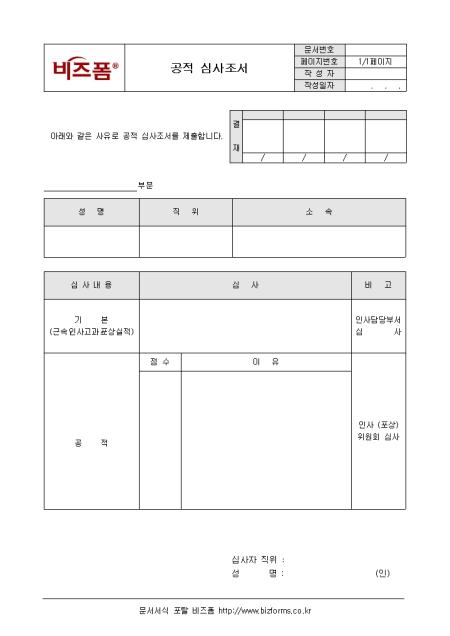 공적에 대한 내용을 심사를 하고자 할 때 사용하는 공적 심사조서입니다. 성명, 직위, 심사내용, 심사 등의 항목으로 구성되어있으며 심사결과에 따라 포상이 이루어집니다.
