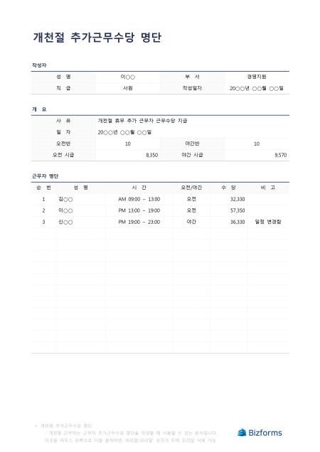 개천절추가근무수당명단입니다. 개천절에 근무하는 추가 근무자의 추가근무수당 리스트를 작성할 때 사용할 수 있는 문서입니다.