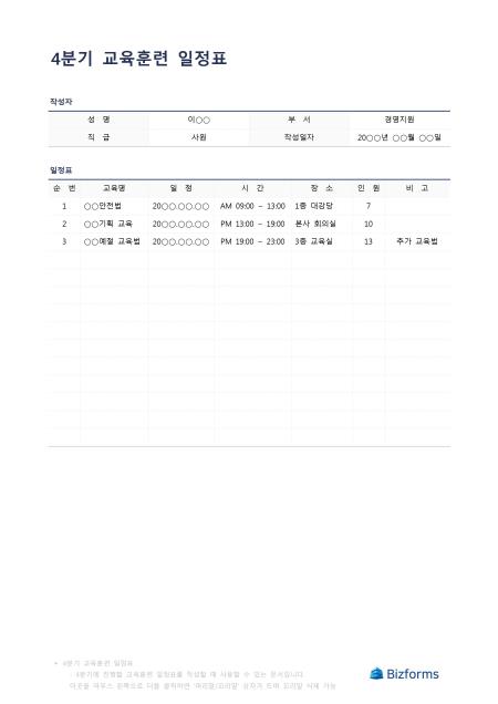 4분기교육훈련일정표입니다. 4분기에 진행할 교육훈련 일정표를 작성할 때 사용할 수 있는 문서입니다.