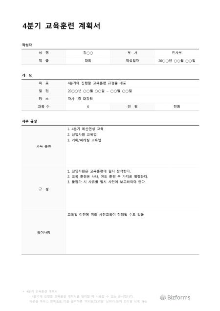 4분기교육훈련계획서입니다. 4분기에 진행할 교육훈련 계획서를 작성할 때 사용할 수 있는 문서입니다.