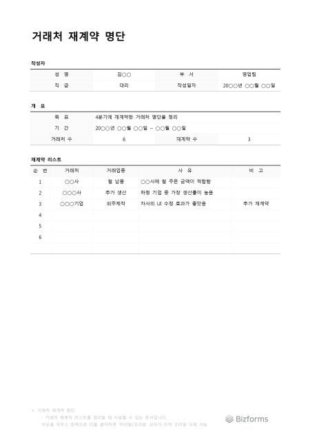 거래처재계약명단입니다. 거래처 재계약 리스트를 작성할 때 사용할 수 있는 문서입니다.